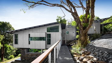 Cemintel Barestone was used to seamlessly connect the home with the rugged Australian bushland, while also complementing the sculptured form of the exterior. Its raw finish is designed to weather naturally, blending into the natural environment around it and is non-combustible and suitable for use in bushfire (BAL) areas.